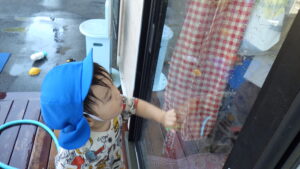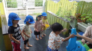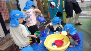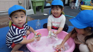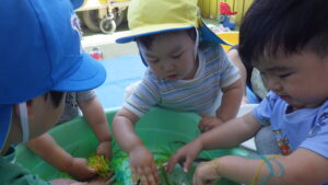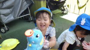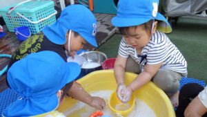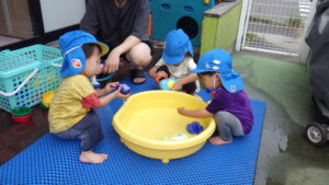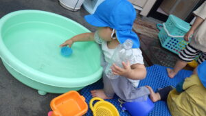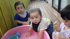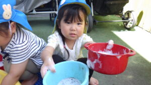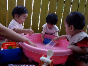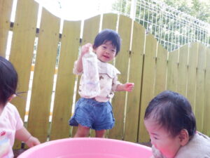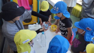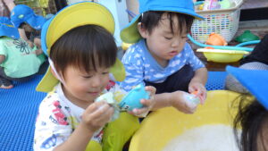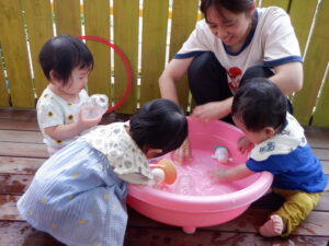 誕生会の後、ぴよぴよさんときらきらさんはお外でさっそく色水遊びを楽しんでいましたよ~。
