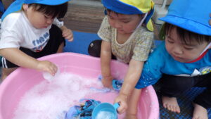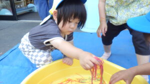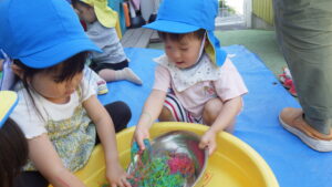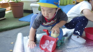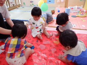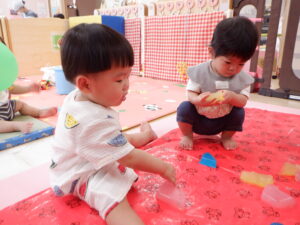 この日は大きいままの寒天を出してみました。以前は小さく切った寒天を触っていたので、大きな寒天に興味津々な様子で手を伸ばしていました。感触遊びを楽しむ中、プルプルで冷たい寒天が美味しそうに見えたのか、口元に持っていこうとする子もいました😊
