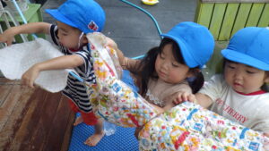 気温が高い日は、なかなか戸外遊びが出来ないので室内で様々な遊びを楽しんでいます。
