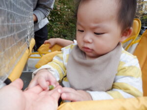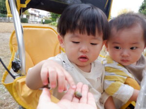 保育士がどんぐりを拾って見せると興味津々に手を伸ばすすやすやさん😊