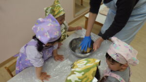 ぴよぴよ組さんが種取りしたかぼちゃを、おいしいプリンにしていきます!