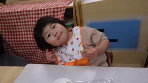 「やってみる!」と栄養士と一緒にホイップクリームを絞ってみるきらきらさん✨