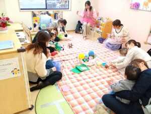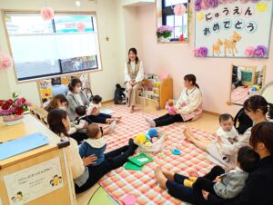 お名前を呼んで一人ずつ紹介したり、おうちの方と一緒にわらべうたあそびをしたりと和やかな会となりました。