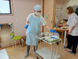 栄養士の話を聞いて、早速クッキングスタートです!