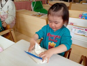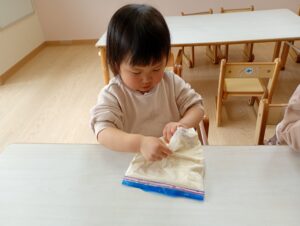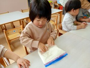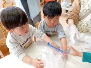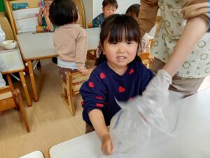 「つめた~い!」「ツルツルする!」と感触を味わいながら楽しんでいました♩