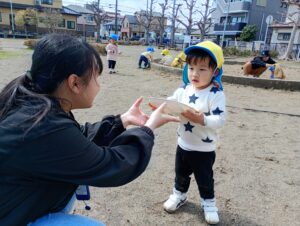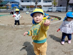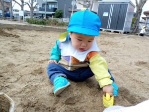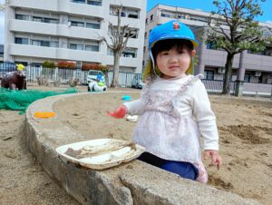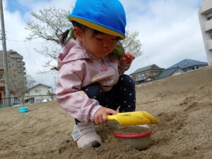 また、砂遊びではスコップで地面に穴を掘ってみたり、色々な型や容器に砂を乗せ「ご飯で~す」と保育士に見せに来てくれます✨