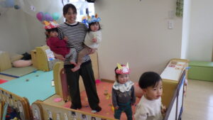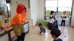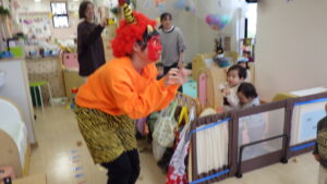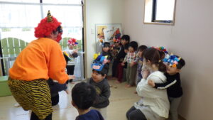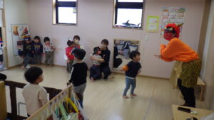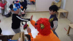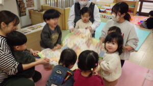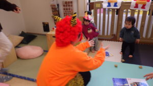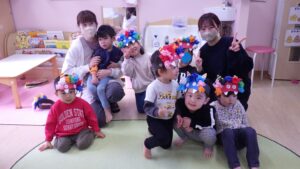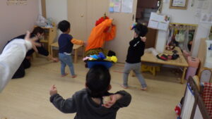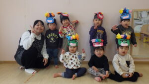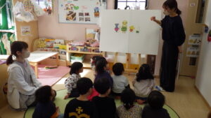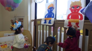 豆まきの前に、わらべ歌「おにさのるすに」をしたり、パネルシアター「だれのパンツ」を見たりしました!