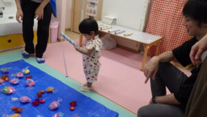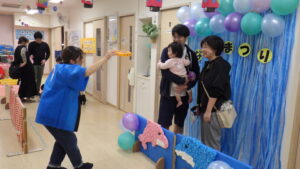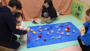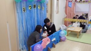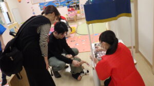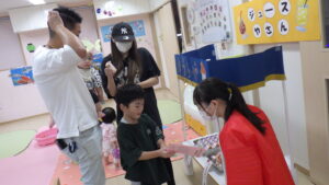 お家の方と一緒に色を塗ったお面も付けて、各コーナーを回りました。
