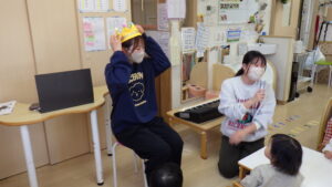 お誕生日の保育士に「好きな色は?」「好きな食べ物は?」と質問したり、ハッピーバースデーの歌をみんなで歌ったりと、楽しい雰囲気の中でお誕生会に参加することができていました。