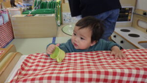 「これは何かな?」と保育士が問いかけをしたり、実際にカエルやコウモリの鳴き声を流したりしたことで、よく聞こうと耳をすませたり「カエル!」「トンボ?」「コウモリじゃない?」と自分の考えを言葉にして伝えてくれる姿が多く見られました!